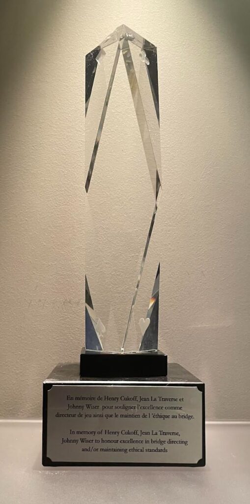 In 2023, ACBL District 1 decided to honor Eric’s memory by recognizing his contribution to the younger players, some of whom have gone on to become Canadian and international stars. A trophy will be awarded annually to a young player (25 and under) in the district, based on performance-related criteria.