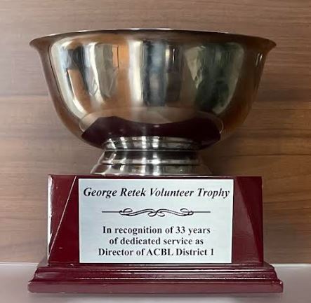 The District 1 Board of Directors, on George Retek’s retirement from the ACBL Board of Directors, decided to honour George for his many years of service, by honouring District 1 members, who, like George, donated many years of exemplary service to their Unit and/ or District.